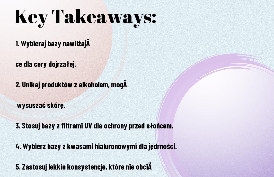 Wybierając bazę pod makijaż dla cery dojrzałej, zwróć szczególną uwagę na składniki, które mogą poprawić wygląd Twojej skóry. Wysokiej jakości baza powinna zawierać składniki nawilżające, przeciwstarzeniowe oraz te, które poprawią elastyczność. Składniki aktywne są kluczowe dla utrzymania zdrowego i młodzieńczego wyglądu, dlatego warto poznać, na co zwracać uwagę podczas zakupu.